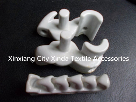 瓷船(Porcelain boat)、瓷梳五眼板(Porcelain comb and Five board)、瓷眼(Shuttle porcelain eyes)、导纱瓷牙09108、瓷筒管座、纺织瓷件等纺织导纱配件。